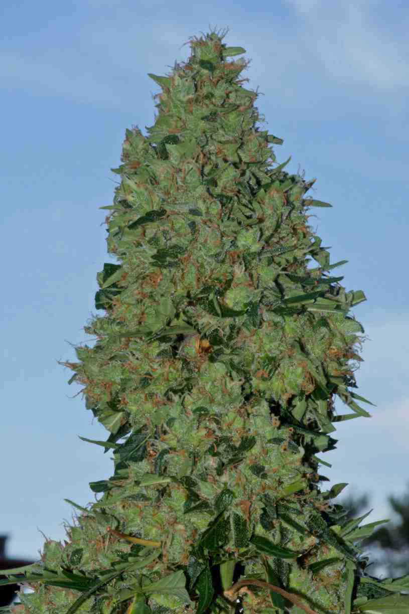 - Phenotype #1 was a single-cola structure that would be great for sea of green, with two small side branches. The cola started just above the soil line and continued in a thick, fat cone to the top of the plant. The phenotype didn’t grow more than three feet high. The leaves were long and thin, like a pure Sativa, and very dark bluish-green. The buds smelled like pepper and pine, with just the faintest hint of anything resembling blueberry or other fruit, and were rock-hard. The main cola on one plant was nine inches long. This phenotype was ready for harvest 62 days after germination. Two plants out of ten were this phenotype.