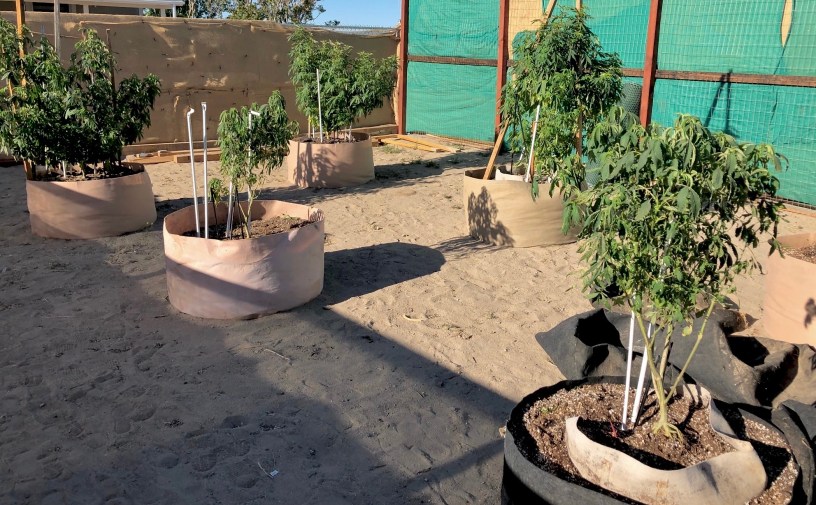 Despite conditions so harsh that most cannabis strains would either die or produce weightless yields of thin, hopeless buds, Paul’s grow phase Homers are at the end of May already 4-5 feet tall, growing in huge aboveground grow bags in perlite-laden soil, with nice green leaves and looking like they’re going to make it just fine through the brutally incinerative summer and yield about a pound or more per plant.