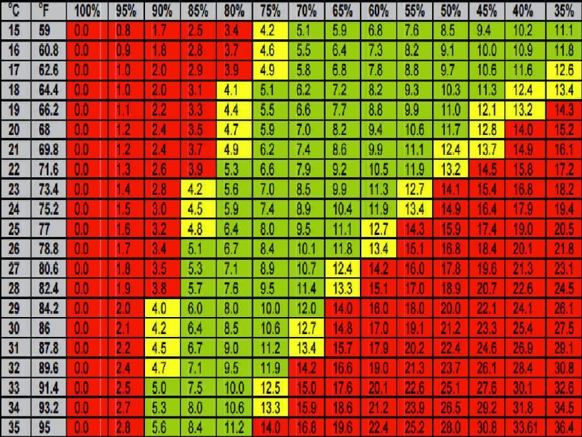Use this chart as a guide for controlling grow room temperature and relative humidity so your plants breathe easily and have the optimal amount of internal water flow.