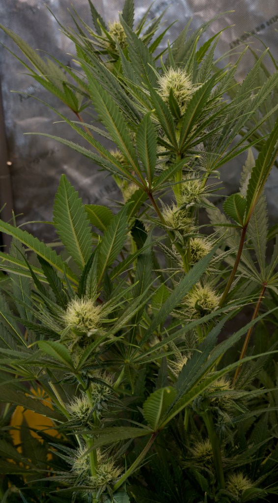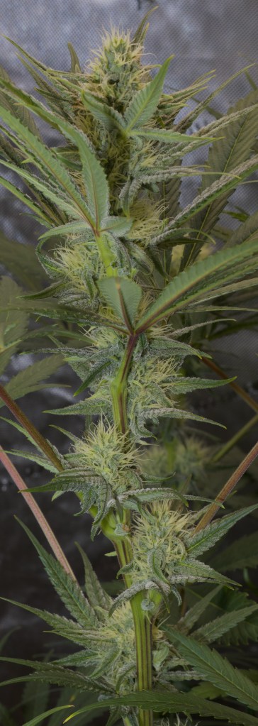 The long floral stalks had short internodes to begin with, which to our amazement filled in overnight in some cases. Transition from primordial flowers to early flowers to dense, resinous flowers was extremely rapid. By day 33 of bloom phase, we had to add support stakes to keep heavy buds from breaking stalks. Thus, this strain is ideal for the screen of green (SCROG) method of supporting plants.